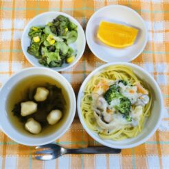 今日の給食は『きのこのクリームスパゲティー』です。 鶏ももこま肉・玉ねぎ・にんじん・しめじ・エリンギ・ブロッコリーが入っており、バターと小麦粉でルーを作って入れています! 乳アレルギーのお友 … 続きを読む