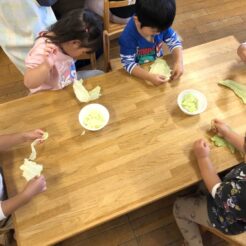 今日は、うさぎ組さんで給食の先生と一緒にきゃべつちぎりをしました。 スープに使うきゃべつ、お口に入る大きさでちぎります。 「このくらい?」「そうそう!お口に入る大きさだね」先生と一緒に給食づ … 続きを読む