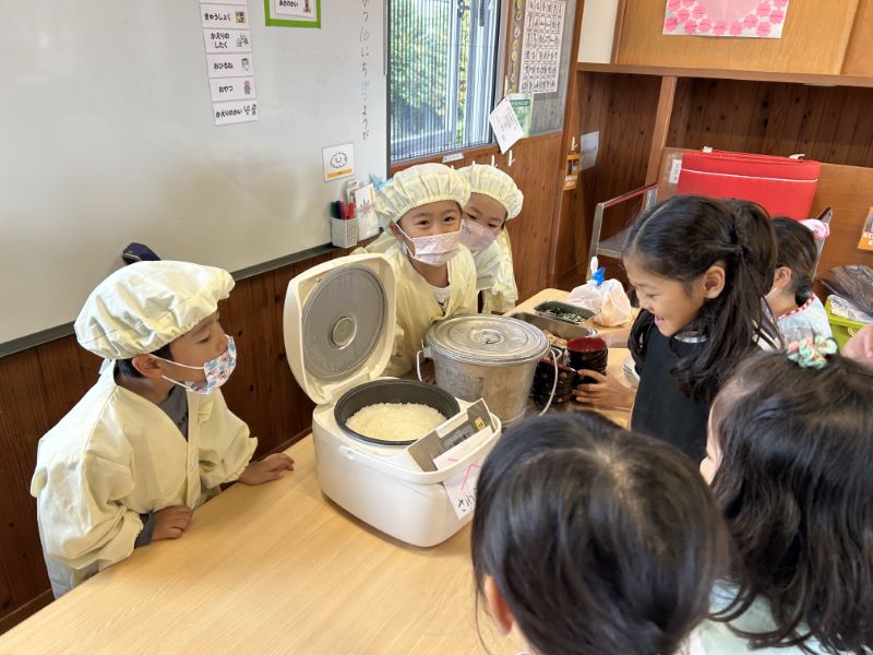 お部屋で炊飯。給食の時間に炊き立てごはんをみんなで見てから配膳です🍚