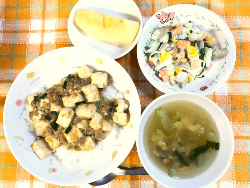 今日の給食は「麻婆ライス」、長年の定番メニューでお野菜もたっぷり入っています。にんにく、生姜、長ネギ、玉葱、人参、干し椎茸、ニラといったみじん切り野菜を豚ひき肉と炒めてから、かつおだし汁を加えて煮て、味噌、砂糖(花見糖)、醤油、酒で味付け、とうふを加え仕上げに片栗粉でとろみをつけ仕上げにごま油を加えています。ごはんにたっぷりかけて食べられるので、大豆製品がたっぷりとれるメニューです🍚