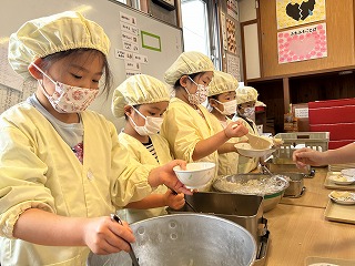 お当番活動もスムーズになり、小学校の給食のようですね。上手に盛り付けています。