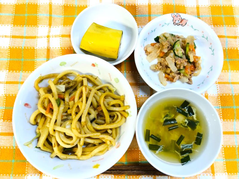 今日は、お野菜たっぷり「焼うどん」です。きゃべつ、人参、玉葱、しいたけ、ピーマンを炒めているのでかさが減り、おうどんと一緒に野菜がたくさん食べられます。豚肉とたっぷりお野菜からのうま味で、味付けは塩と醤油のみ。仕上げにかつおぶしが入り美味しさアップ、よく食べてくれました。サラダには大根、人参、きゅうり、スープには玉葱とニラが入り、今日の給食で、幼児が1日に必要なお野菜の半分近くとれるメニューです。