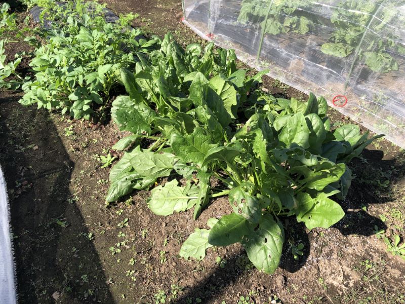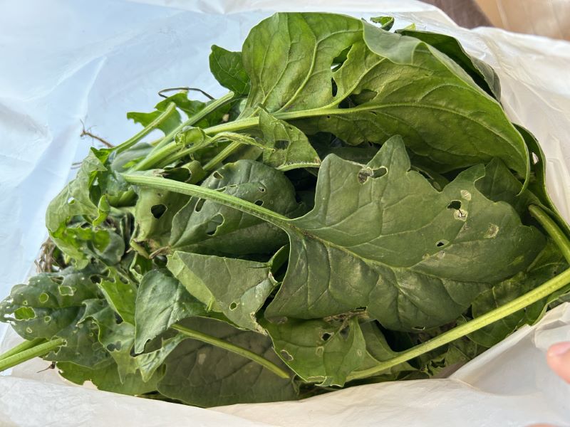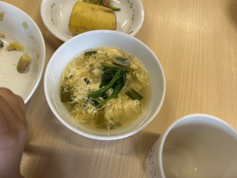 ぱんだ組さんで、畑のほうれん草を収穫。お部屋で茹でて、スープに入れて食べました
