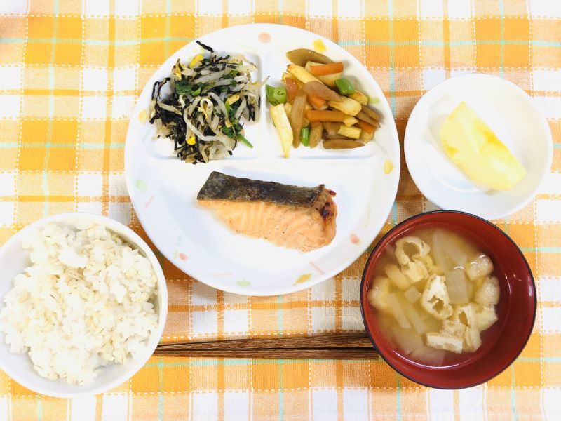 朝晩の涼しさはあるものの、日中の日差しが10月とは思えないくらい暑い1日でしたが、この暑さのおかげで今日はさっぱり梅味の鮭の梅焼きが美味しく感じた?かも知れませんね。ほんのりの梅味、ごはんがすすむ味です🍚 梅を使ったレシピはいくつかありますが、シンプルな魚の照り焼きレシピ+梅肉で、脂ののった鮭がさっぱりと美味しく仕上がりました。じゃが芋のきんぴらは、じゃが芋を素揚げにしてから、ごぼうと人参のきんぴらの仕上げに加えて炒めています。見た目もきれいに仕上がり美味しい1品です。