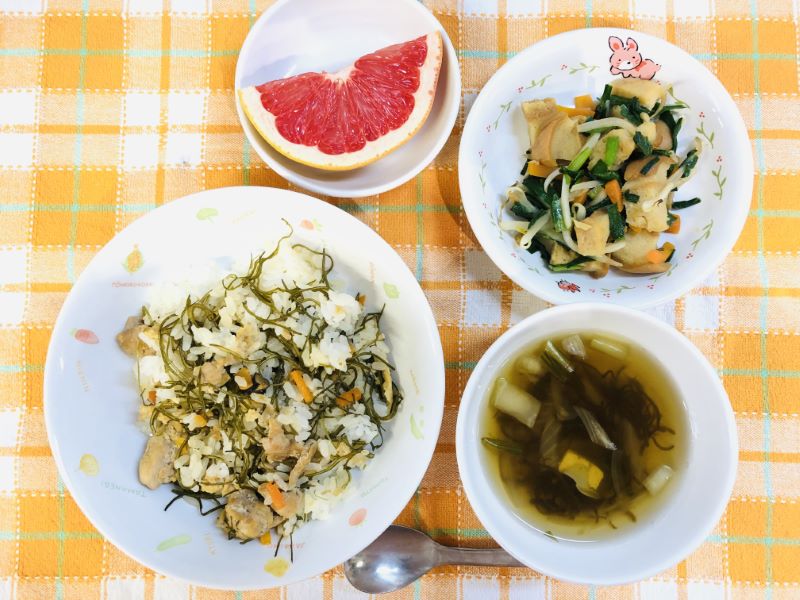 給食は沖縄料理の「ジューシー」を取り入れたメニュー。切り昆布、干し椎茸、豚肉、油揚げ、人参を甘めに炒め煮にして、炊きあがったごはんに混ぜ込んでいます。昆布と豚肉のうま味でおいしい保育園の定番メニューです。