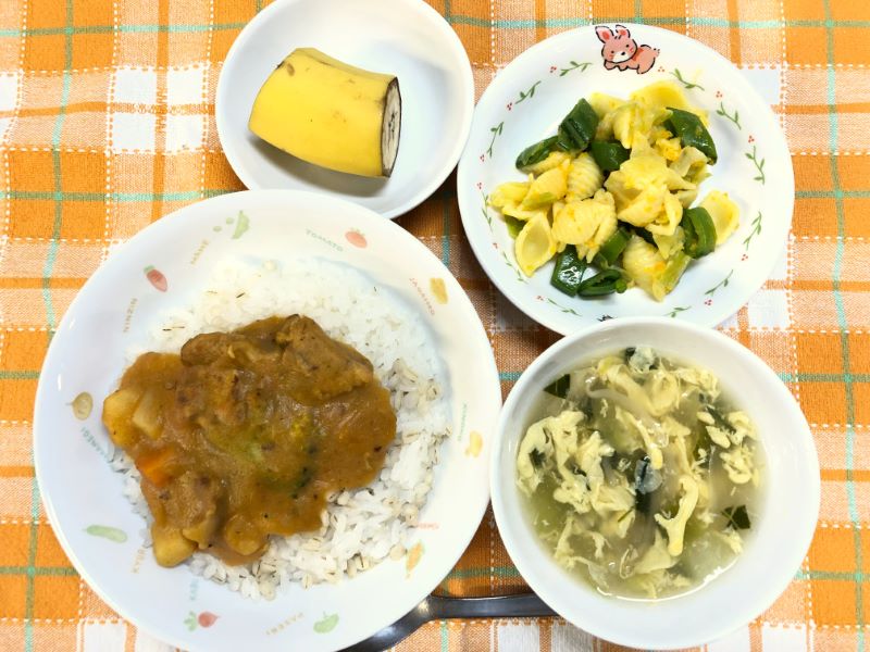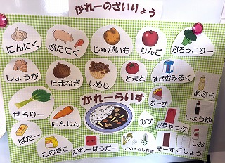 カレーの材料は、この通り。いろいろな材料を使います。昨日買い物してくれているので、子どもたちもいろいろなお野菜を知ることができました。