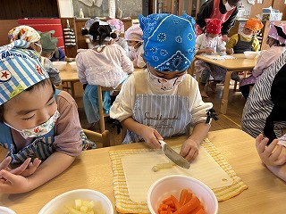 包丁の使い方を教えてもらってから、にんじん、じゃがいもを小さく切ります。材料を持つ手は、お指をしまって「猫の手」です。
