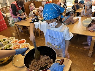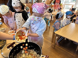 らいおん組さんで最後の調理保育は「保育園のカレー」づくりにチャレンジです。