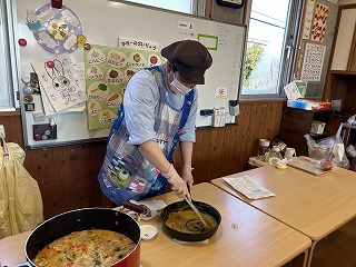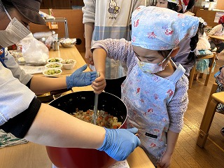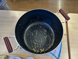 みんなで順番に炒める体験です!鍋のふちに手が当たらないように気を付けて💦