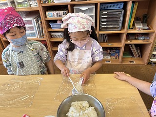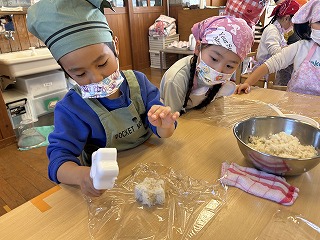 お水を加えて煮込んでいる間に、みんなで炊いたごはんを型抜きにしました。