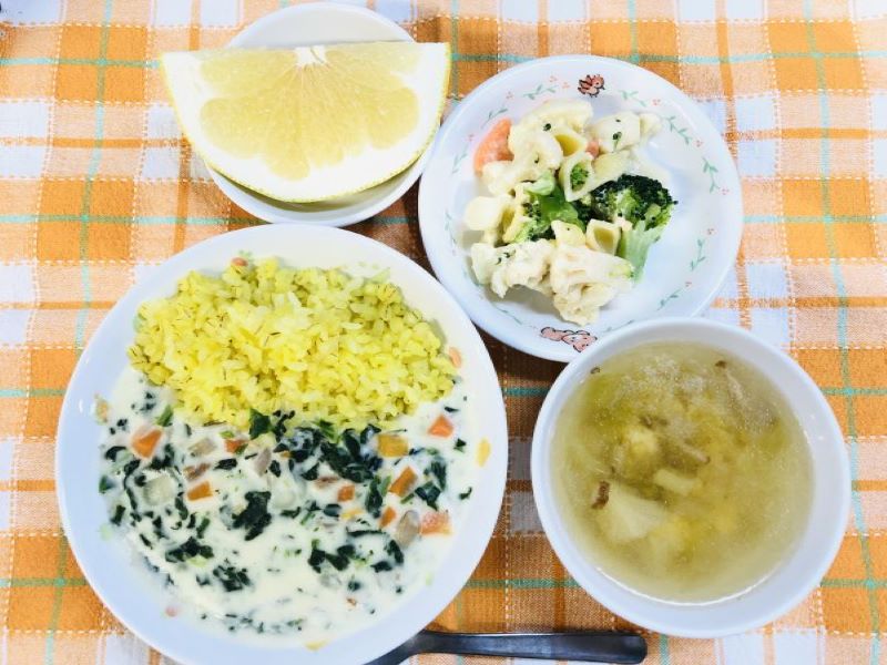 黄色いターメリック入りの麦ごはんに、ホワイトソースをかけたクリームライスに彩りを添えていました。