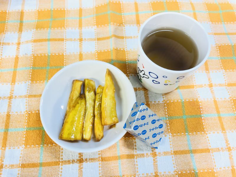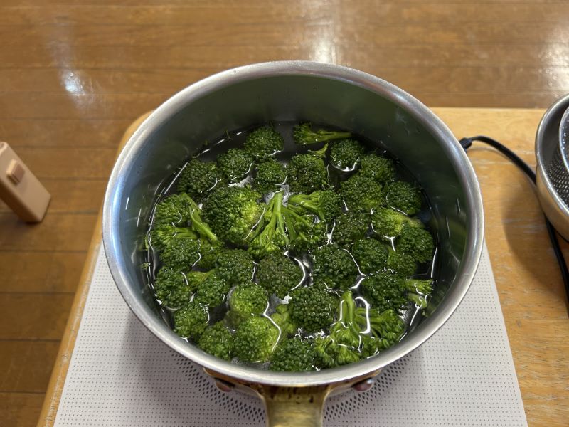 給食前の時間にお部屋で茹で、クリームライスの上にとれたてスティックセニョール🥦をのせてたべました。