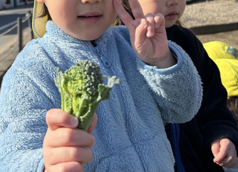 今日、ぱんだ組さんでは、畑で栽培中の「スティックセニョール」を収穫。