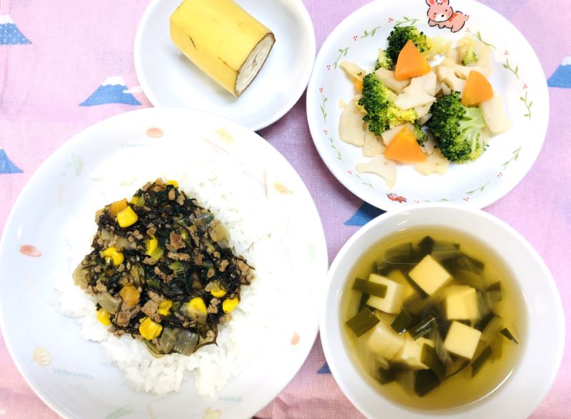 にんにく、生姜、豚ひき肉、人参、たまねぎ、コーン、小松菜、もずくが入り、味付けは塩、しょうゆ、みりん、砂糖(花見糖)、仕上げにごま油を使っています。コーンやお野菜の甘味と、もずくのつるつる感で食べやすい丼メニューです🍚