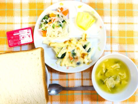 やわらかめのグラタンに、サラダは切干大根を使った「カミカミ」のサラダです!
