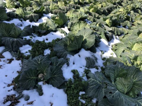 雪が降り積り、保育園の畑にとっては、よい水分補給になりました。のらぼう、スティックセニョール↓