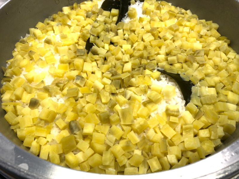 朝晩涼しくなり秋の気配、食欲の秋突入です。 秋は美味しいものがたくさんありますね。今日は、旬のさつま芋をたっぷり使ったさつまいもごはん。黄色くて甘くてホクホクのさつま芋、昆布と塩少々を加えて炊いています🍚 炊きあがりは彩りも鮮やかです(写真は一緒に炊いた昆布がのっています)