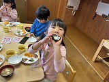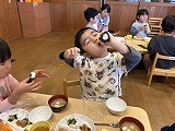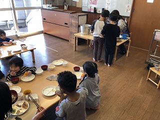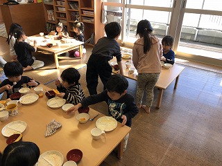なめこの味噌汁人気! 明日のサンタお楽しみ会の準備のため、今日は椅子無しでの給食。