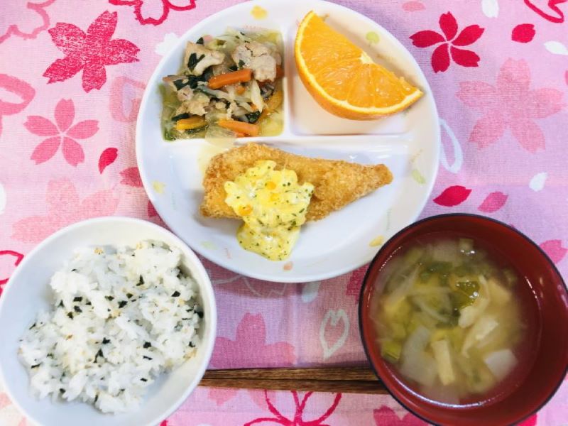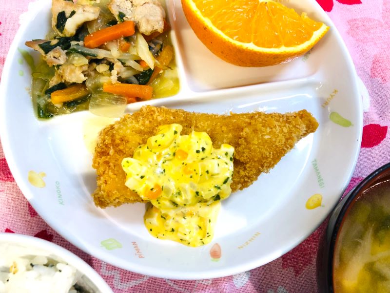 刻んだ玉葱を油で炒めておき、刻んだゆで卵にマヨネーズ、塩、レモン汁、パセリを混ぜた手作りタルタルです。マヨネーズ味なので子どもたちもあまり抵抗なかった様子。サクサクのお魚によく合う味です。