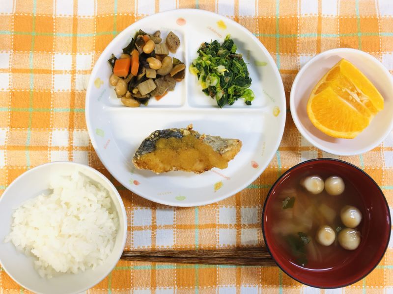 今日は和食メニュー🍚 「揚げさわらのおろしがけ」は、さわらの切り身を生姜醤油で下味をつけ、片栗粉+小麦粉をまぶして揚げ、おろしだれをかけています。