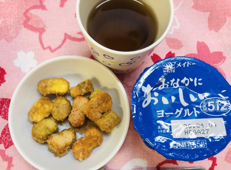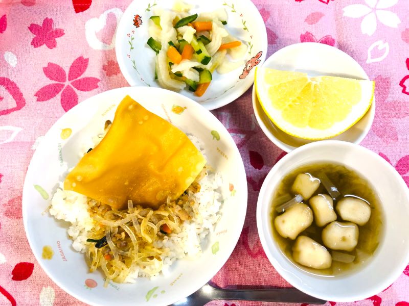 ごはんの上に春巻きの具をのせ、こんがり揚げた春巻きの皮(ワンタンの皮を使用)をぱりぱりと割ってのせて食べます。春巻きをごはんと一緒に食べている感じですね。保育園の定番メニューになっています。