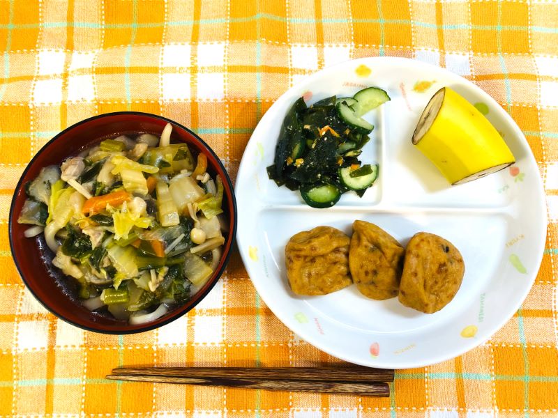 今日の給食は寒いにぴったりのあったかい「きのこの煮込みうどん」🍄えのき、まいたけ、しめじがたっぷり入り、たまねぎ、人参、白菜、ねぎ、小松菜も入り野菜たっぷり具だくさん。鶏肉とお野菜、さらには昆布、煮干し、かつおぶしからのうま味もプラスされ、味付けは、醤油、塩、みりんのみなのですが、うま味たっぷり汁です。