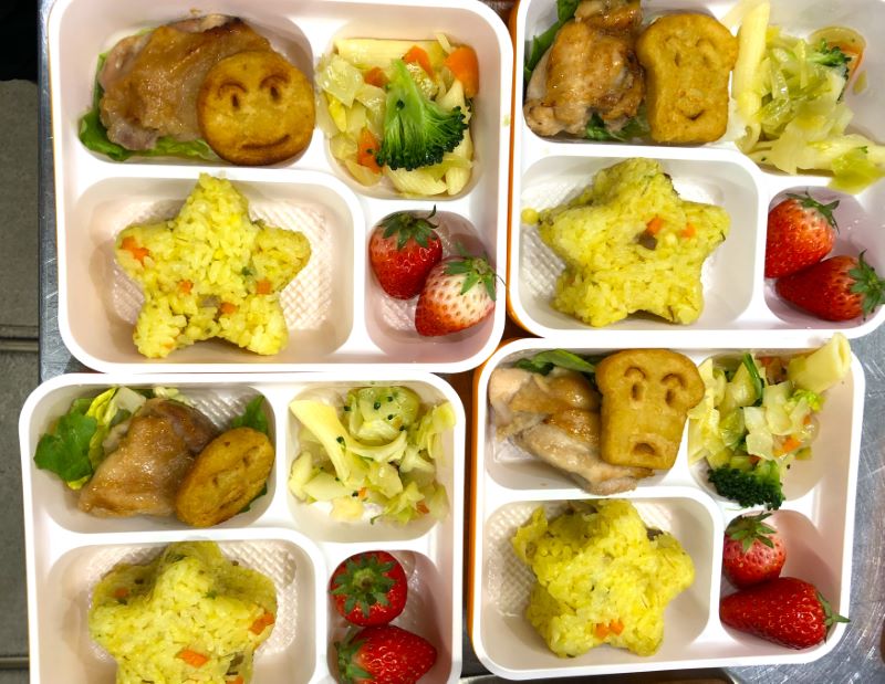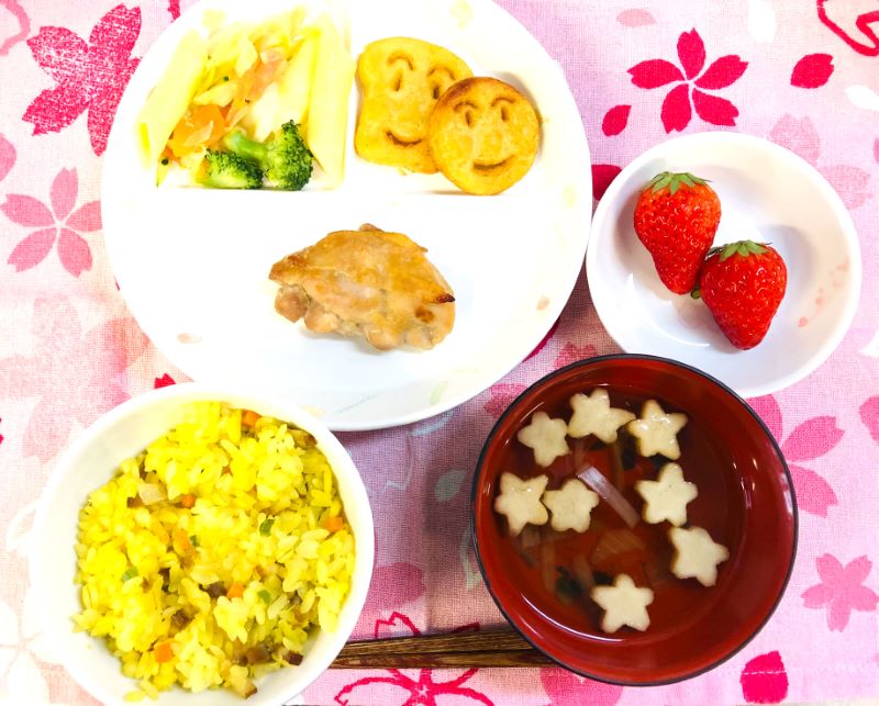 カレーピラフは、ターメリックで鮮やかな黄色、味付けは辛みのないカレー粉(カレーアロマ)を使用した、マイルドカレーピラフ。弁当用のごはんは、星型⭐です。