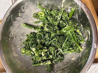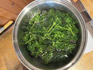 鮮やかな緑のスティックセニョール、のらぼうは、さっと茹でるのがベスト。