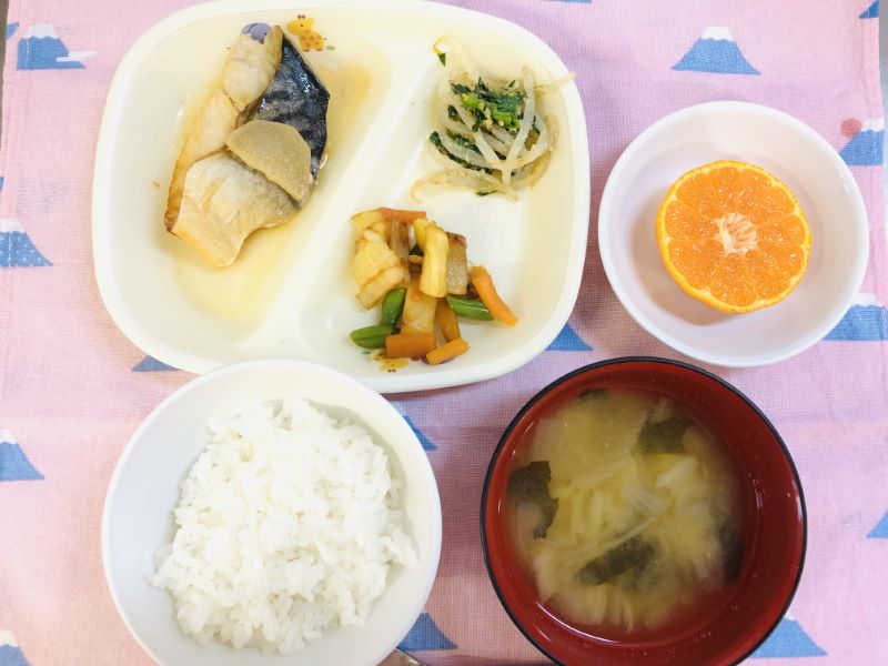 給食は、和食メニュー。煮魚のサバは、スチームを入れたオーブンで調理。煮汁を煮詰め煮えたさばにかけていて、ごはんによく合う味に仕上がりました。