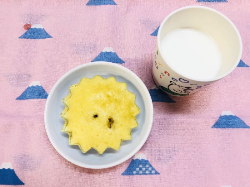 今日のおやつは、手作りの肉まん。小麦粉、ベーキングパウダー、豆乳、砂糖(花見糖)、卵の生地にターメリックで色付けした蒸しパンの生地を敷き、カレー味に炒めた肉みそをのせて、上から生地を流し入れて蒸しています。