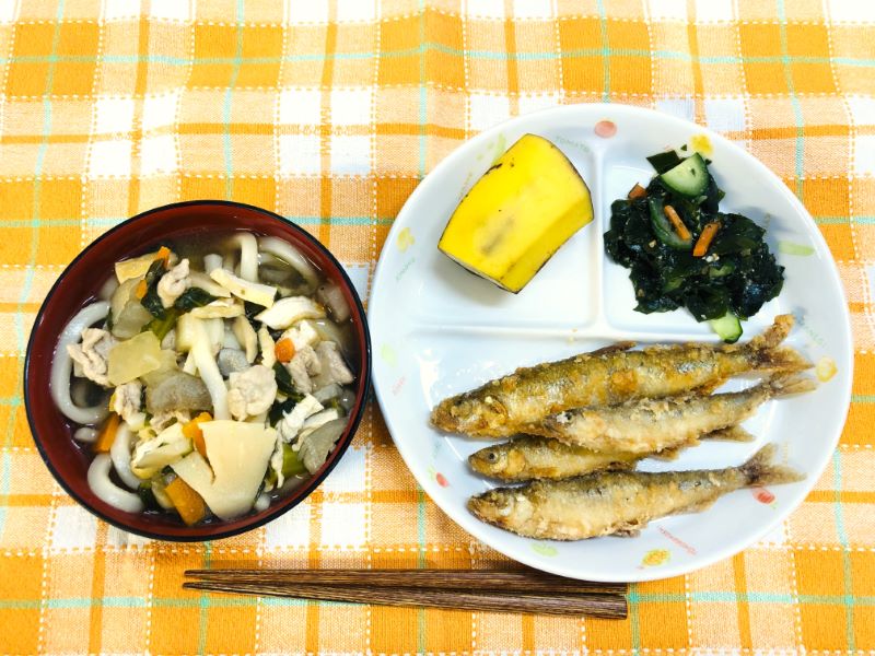 そして旬のワカサギが登場🐟生姜醤油で下味をつけ唐揚げにしました。わかさぎは、うろこが少なく骨がやわらかいため、丸ごと食べられるのでカルシウムがたっぷりとれるお魚です🦴