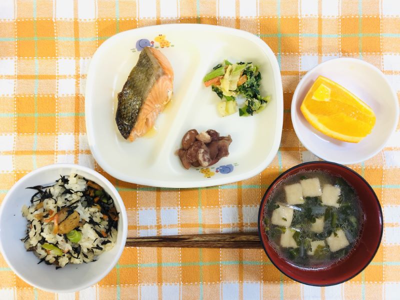 今日の給食は「ひじきごはん」 大豆アレルギー対応で油揚げを抜いていますが、鶏肉を炒め、人参、ひじき、干し椎茸を煮て味付け、仕上げに茹でたいんげんを加えた「ひじきの煮物」をごはんに混ぜ込んでいます。