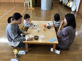 今日は子育て支援センターの食育講習、親子で保育園の給食を味わっていただきました。保護者や子ども同士の交流の場にもなっています。