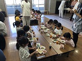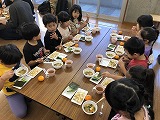 「いただきます!!」らいおん組さんは、ホールで給食を食べました。