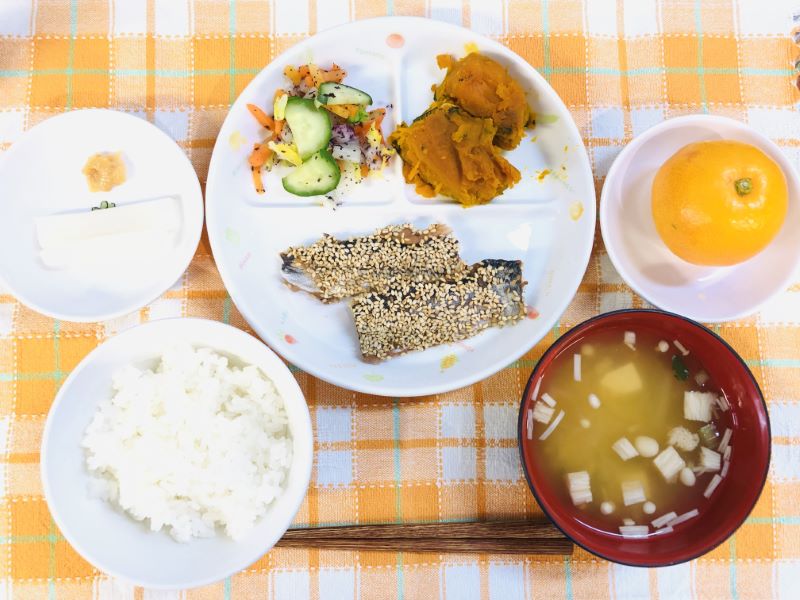 給食は秋刀魚(さんま)が登場。下味をつけ、片栗粉を混ぜ入れ、片面だけにごまをまぶして、オーブンで焼きました。