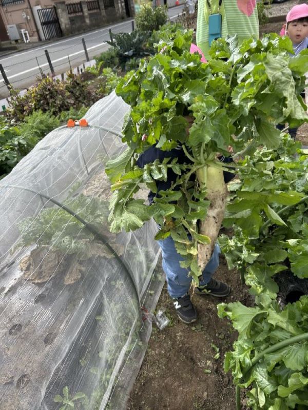 さっそくりす組さん(一時保育)のおともだちが、収穫。葉っぱも大きいね!