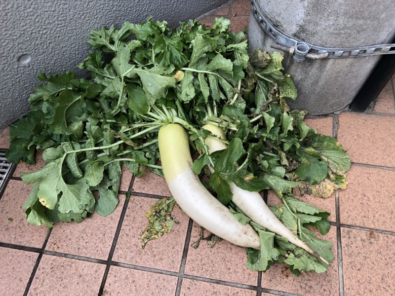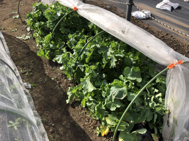 菜園で栽培していた大根を間引きしようと、寒冷紗(白いカバー)を外したところ、今年は温かいこともあり、立派な大根ができていました。