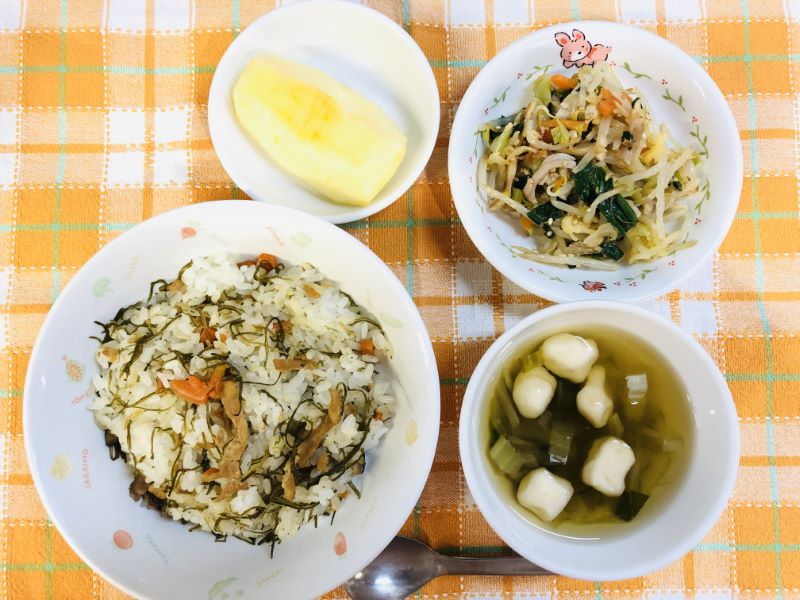 今日の給食は「沖縄料理」のジューシー、アーサ汁。定番メニューなので、子どもたちもよく食べてくれています。