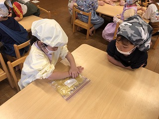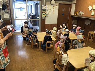 少し冷ましている間に、お片付け。さつまいものお話の紙芝居を読んでもらったり・・・