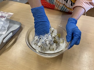 さつまいも、お米の粉、お砂糖、ごまを混ぜ混ぜ。