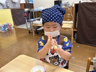 保育園のおやつの中でも人気のある「いもっちだんご」作りにチャレンジです🎵