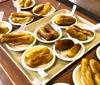 やわらかいお芋を、みんなで順番にトントン、つぶしていもっちだんごづくりです。生のさつまいもはかたくてトントンできませんね💦