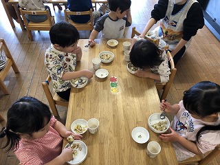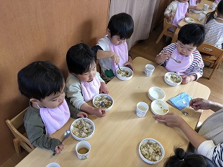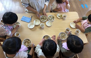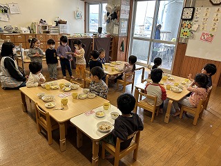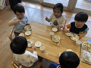 おかわりもたくさん食べるようになり、クラス配膳になりました。