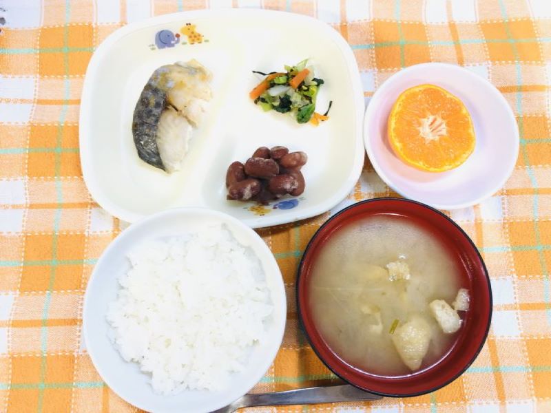 今日の給食は、和食メニュー。ゆず味噌焼きは、ゆずの皮をすりおろして下味に加えているので、子どもたちにも抵抗なく食べられる「ゆず風味」程度のさわやかな香りの焼き魚。ごはんが進む味です。煮豆もなかなかの人気メニューなんですョ。