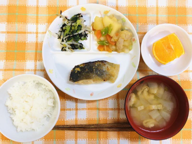 今日の給食は和食メニュー🍚 焼き魚には「ほっけ」を取り入れました。ホッケは大きさにより、青ぼっけ→ろうそくぼっけ→春ぼっけと成長するにつれて名前を変え、成魚になると根ぼっけと名前を変えるお魚🐟です。