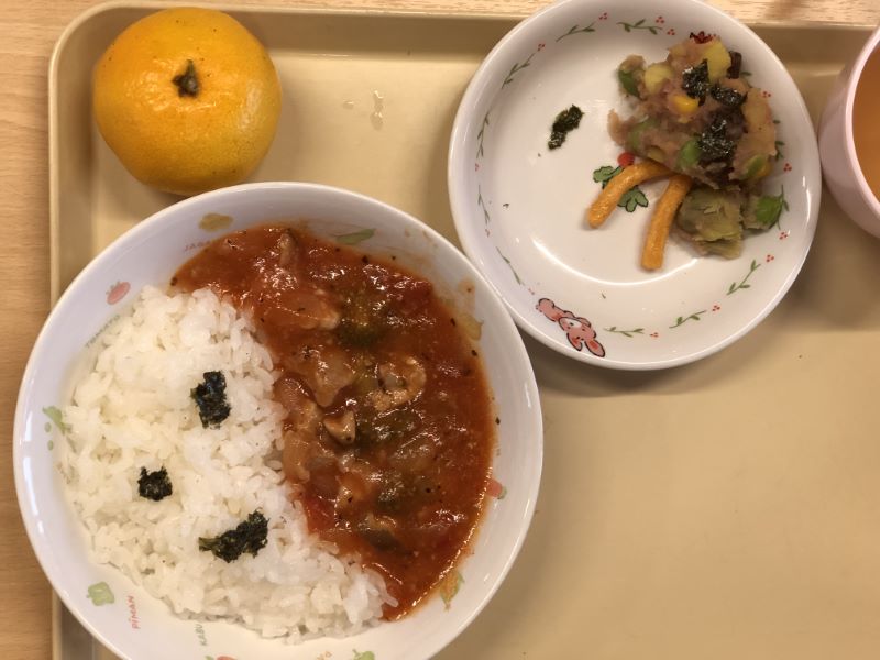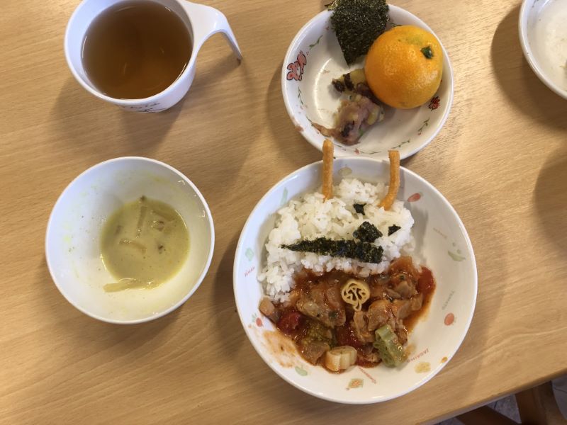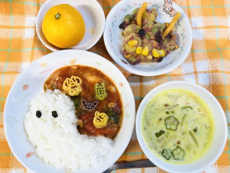 給食もハロウィンにちなんで、おばけランチ👻です。鶏肉のトマト煮ライスに白いごはんのお化け、海苔で目をつけました。幼児クラスのおともだちは自分たちで海苔を切ったり貼ったり、お化け作りをしてから「いただきます!」いろいろな可愛いお化けが出来上がりましたョ。