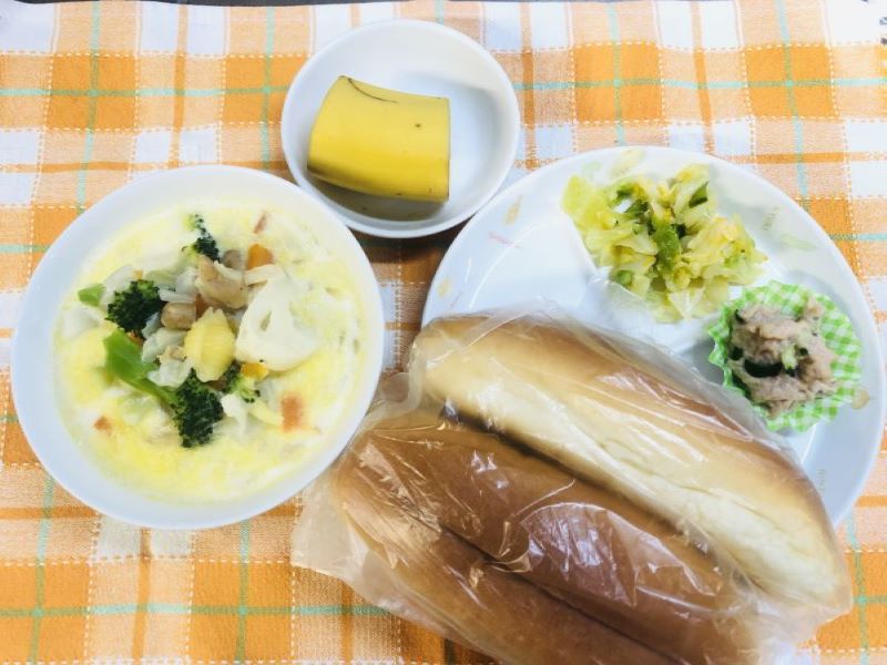 今日の給食の花野菜のクリーム煮、玉葱もたくさん使っているのですが、うさぎ組さんが玉葱の皮むきのお手伝いをしてくれました。給食室も助かっています🎵 クリーム煮には、旬でおいしくなってきた花野菜がたっぷり。