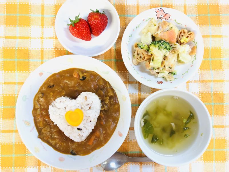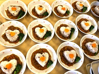 今日は2月のお誕生日会。過ぎてしまいましたが、ちょっぴりバレンタインにちなんだ、ハート💛を入れた給食で、