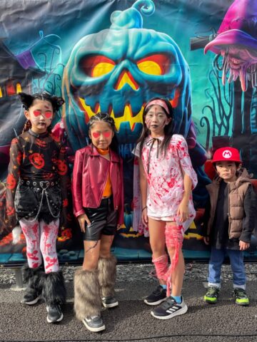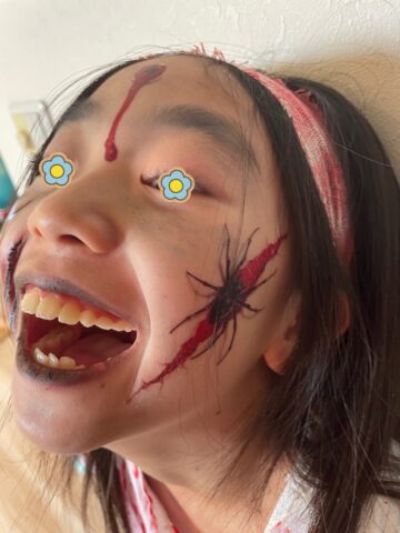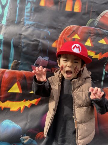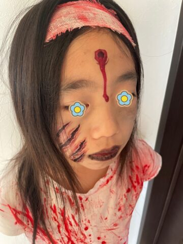 今年のハロウィン🎃 2025年11月16日 日曜日職員ブログ お疲れ様です☆ 少し前になるのですが、娘の習っているダンススタジオで先日ハロウィンダンスイベントがあり、仮装をして踊りました🎃👻 なんとなく可愛らしい仮装では先生に怒られてしまうのでみんな本格的な衣装にがっつりメイクで挑みました☆ 娘は「血まみれゾンビ」になりきり、血まみれの包帯やマントを購入し、Tシャツ短パンは自前のを血のりで染め(私のTシャツが…泣)、とにかく具合悪そうな顔に仕上げ⤴︎⤴︎ キレキレダンスを踊りました☆ 応援の弟もタトゥーを貼りプチ仮装☆ 給食A